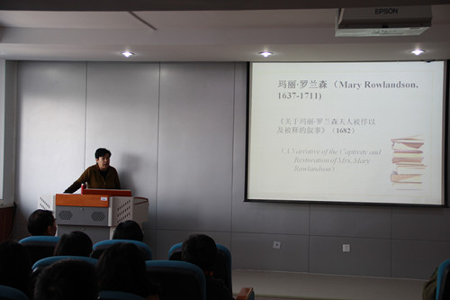 2016年11月1日下午2:30,在如心楼806外国语学院报告厅,北京外国语大学博士生导师金莉教授做了题为《从玛丽・罗兰森的囚掳叙事看北美殖民地白人女性文化越界》的专题报告。