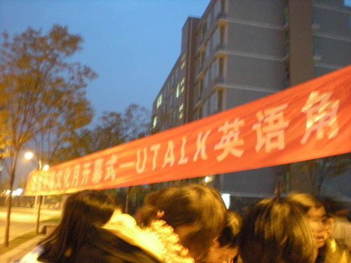 2011年11月4日下午5点半,在动感的音乐声中,北航外语文化月开幕式暨本学期第一次UTALK英语角活动在沙河校区热闹开始。本次英语角活动由外国语学院学生会主办,外国语学院111212小班承办。这次英语角活动还特别邀请到新东方名师齐冉作为主持人,带领北航的同学一起体会英语学习的魅力。
